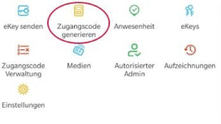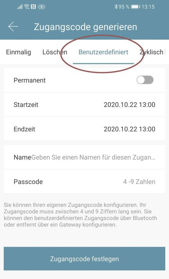 Wybierz dostęp stały lub czasowy. Wprowadź nazwę i kod dostępu. Naciśnij "Zugangscode festlegen“ (Ustaw Kod dostępu), aby przenieść kod do zamka drzwi.