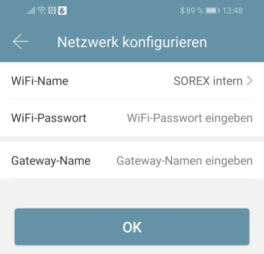 Skonfiguruj Gateway wybierając właściwą sieć WLAN, wprowadzając WLAN-Passwort i przypisując nazwę Gateway. Potwierdź za pomocą "OK".