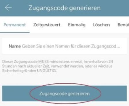 Wybierz dostęp stały lub czasowy. Wprowadź nazwę i kod dostępu. Naciśnij "Zugangscode festlegen“ (Ustaw Kod dostępu), aby przenieść kod do zamka drzwi.