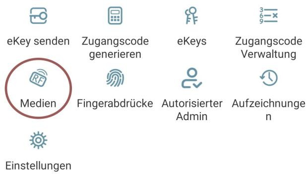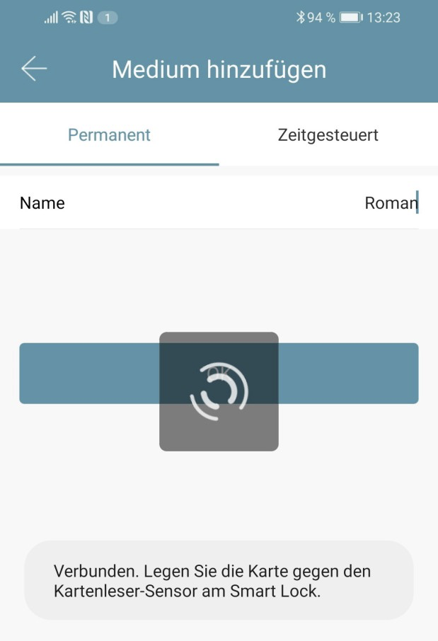 Jeśli twój Smartfon obsługuje NFC i twój zamek podłączyleś z Gateway/Bridge pod „Medium hinzufügen“ pojawi sie również Punkt „Karte aus der Ferne hinzufügen“ (Dodaj karte zdalnie). W razie potrzeby możesz użyć tej opcji, aby RFID-Media dodawać zdalnie. RFID-Medium jest tutaj używany za pośrednictwem NFC twojego Smartfona odczytywany i przekazywany via Gateway/Bridge do zamka. Oznacza to, że nie musisz znajdować sie w pobliżu swojego zamka.