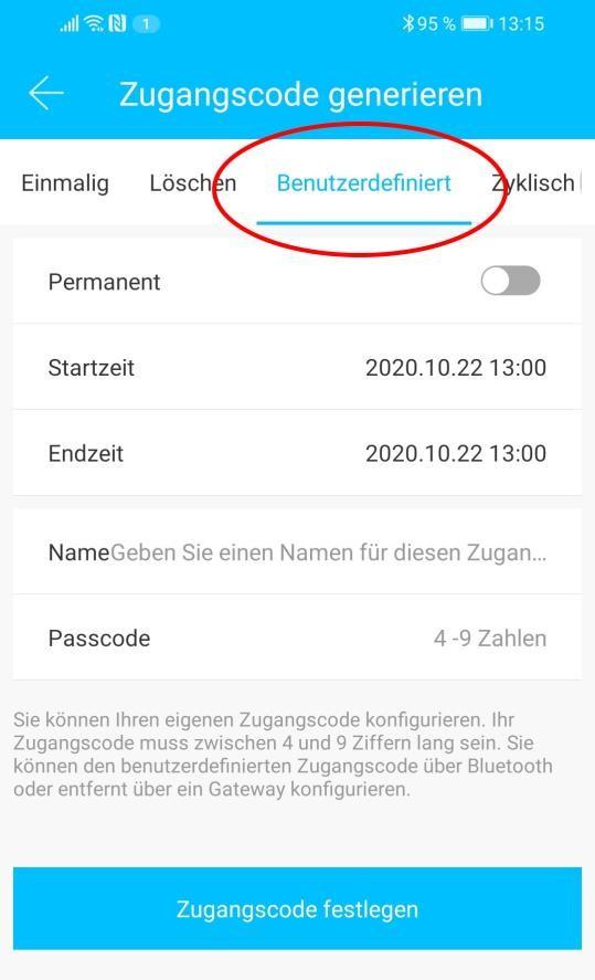 Wählen Sie entweder permanent aus oder geben Sie den Gültigkeitszeitraum an. Geben Sie den Namen und Ihren gewünschten Passcode an. Drücken Sie abschließend auf "Zugangscode festlegen" um den Code zum Türschloss zu übertragen.
