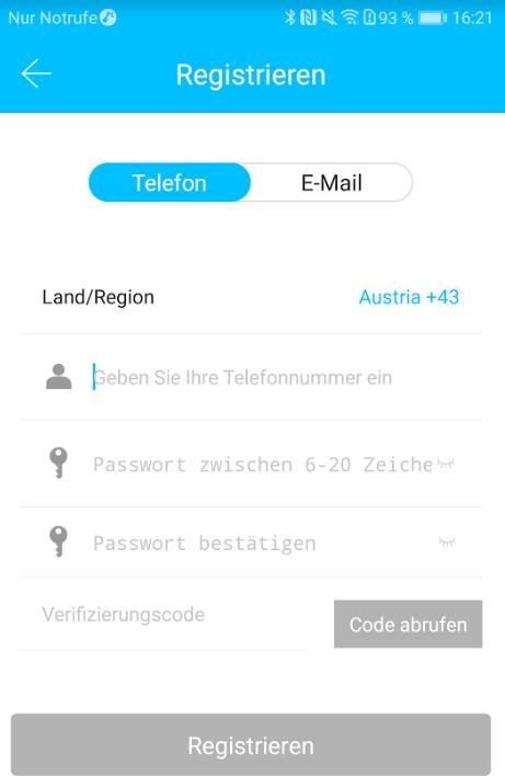Registrieren Sie sich mit Ihrer E-Mail Adresse oder Telefonnummer. Dies ist wichtig, damit Sie bei Verlust Ihres Smartphones oder Passwortes den Zugriff auf Ihr SOREX Smart WiFi Wandleser wiederherstellen können.