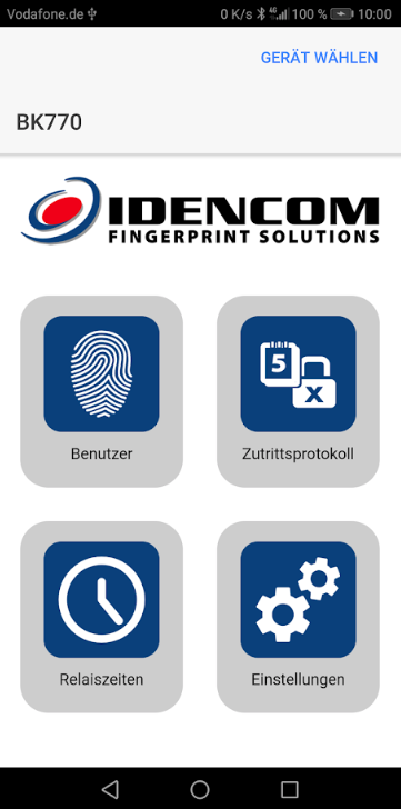 Die App verbindet sich automatisch mit dem Fingerscanner, mit dem sie zuletzt Kontakt hatte, aber man kann jederzeit "Gerät wählen" klicken (auf der Hauptseite der App) und einen anderen Fingerscanner auswählen (wenn noch einer in Reichweite ist).