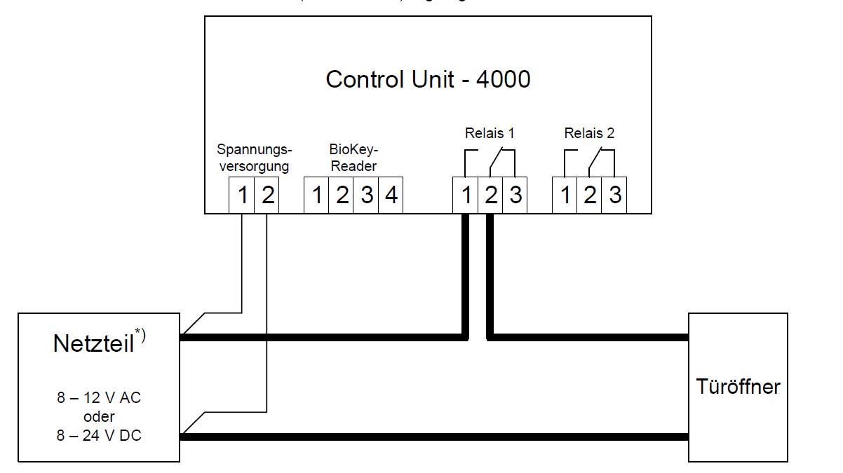 Do obsługi elektro zaczepów rewersyjnych i do sterowania urządzeń, które w stanie „sygnał obecny” są zablokowane i otwierają się przy „brak sygnału” dedykowany jest czytnik linii papilarnych z tzw. Whitebox (DC/AC). Okablowanie prowadzimy poprzez otwieracz (urządzenie otwierające) zamiast zestyk zwierny (zamykacz).
